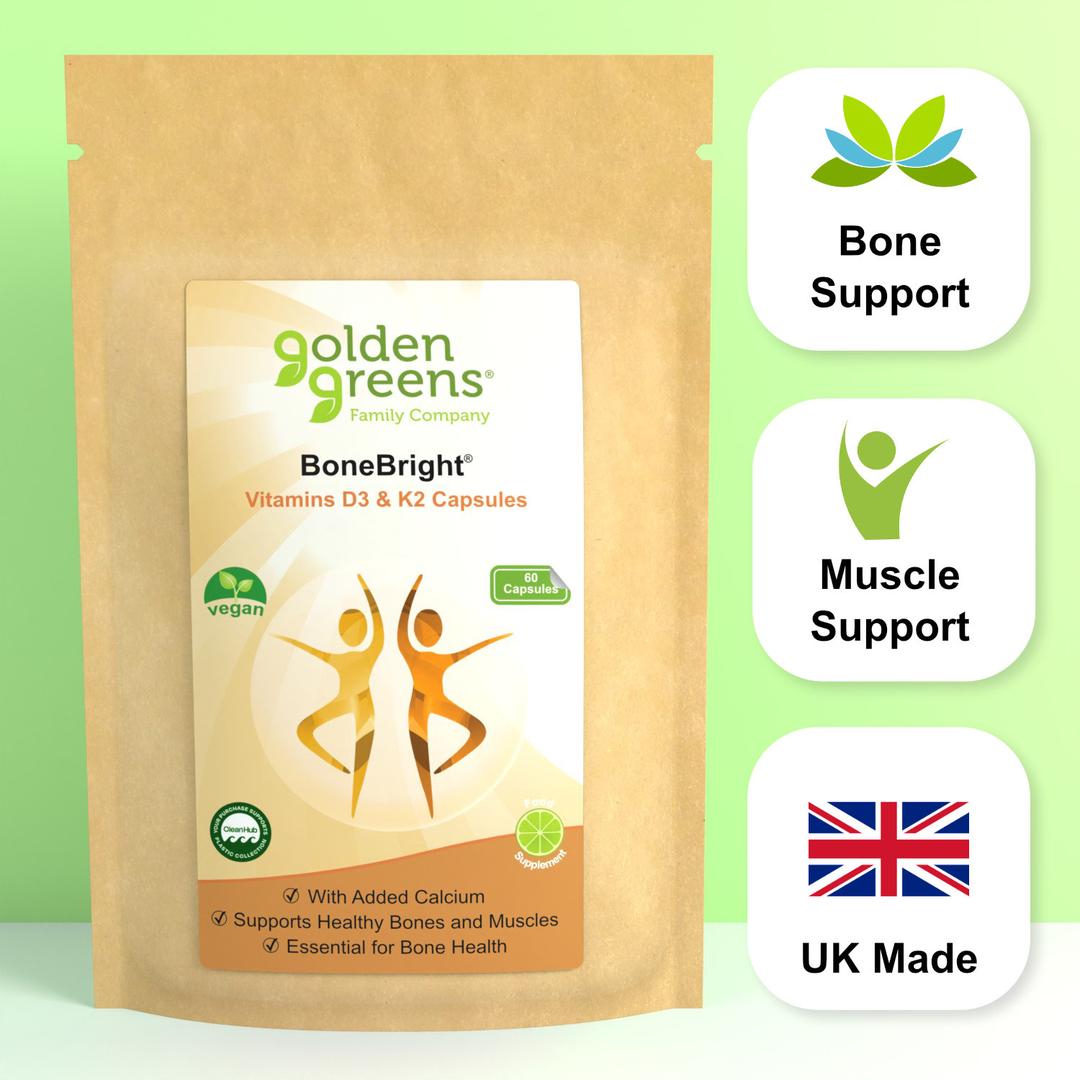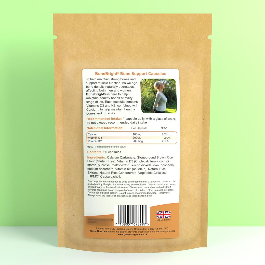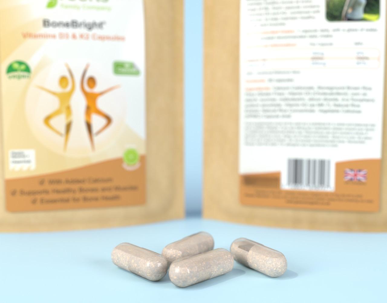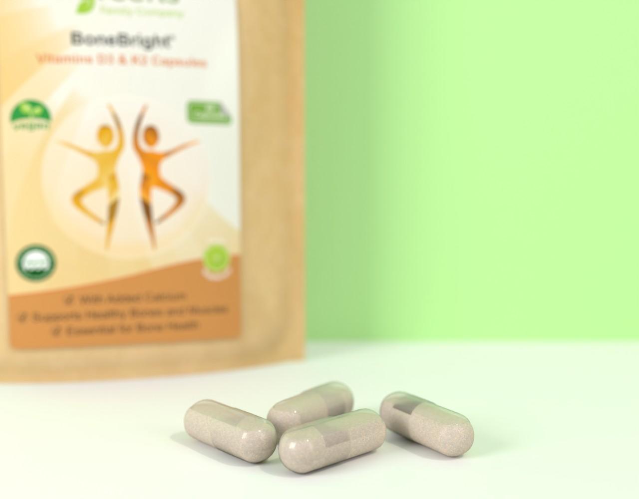 BoneBright capsules are vitamin supplement containing Vitamins D3 and K2 with Calcium to support bone health.